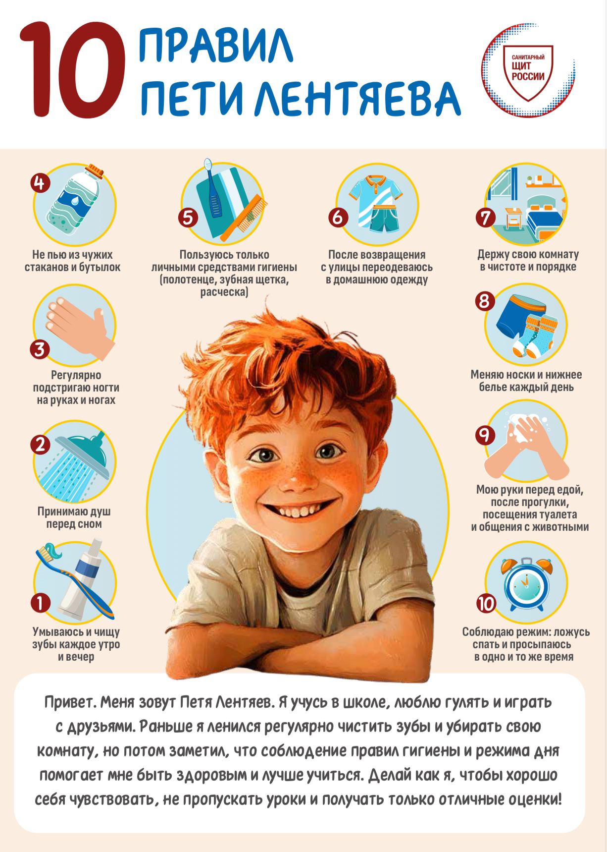 14.10.2024Привет. Меня зовут Петя Лентяев. Я учусь в школе, люблю гулять и играть с друзьями. Раньше я ленился регулярно чистить зубы и убирать свою комнату, но потом заметил, что соблюдение правил гигиены и режима дня помогает мне быть здоровым и лучше учиться. Делай как я, чтобы хорошо себя чувствовать, не пропускать уроки и получать только отличные оценки!